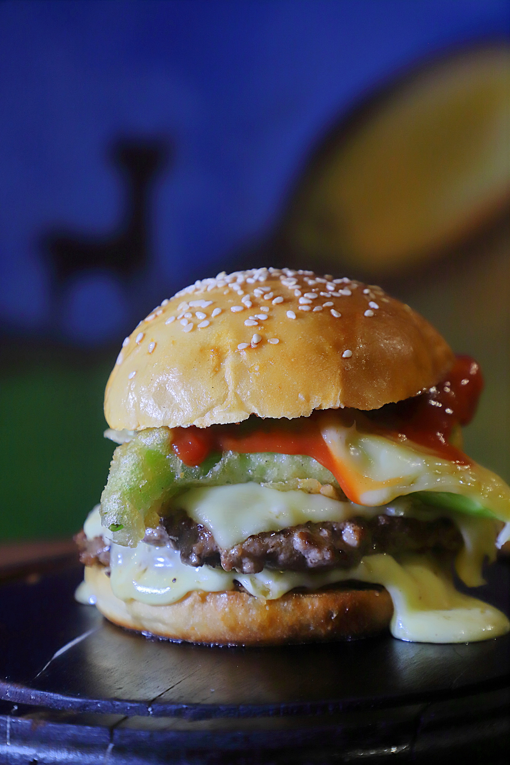 Pan de hamburguesa, doble hamburguesa de 250 g cada una y queso fundido, todo coronado con un ají verde apanado y crocante relleno de queso y tocino, todo con un suave toque de kétchup. Casi no pica.