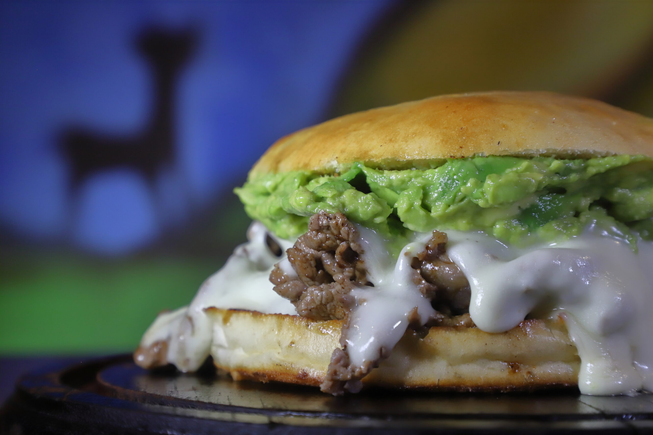Pan amasado, harto queso, harta palta, mayo de la casa.